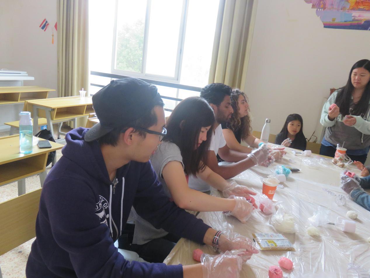 2018年6月1日,加拿大留学生学习的主要的课程是月饼制作和中国书法,第一堂课是学习月饼制作,老师事先将材料准备好,让大家围着桌子四周,首先介绍了什么是冰皮月饼,月饼的文化意义。然后给大家示范制作方法和程序,将面团揉好,加入馅,放到模具里做出大家喜欢的造型,留学生学得很认真很感兴趣。