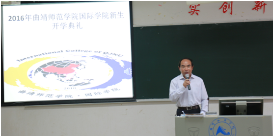 2016年9月18日下午3:00-4:30,国际学院举行2016级新生开学典礼。党总支书记吴郁良主持开学典礼,敬龙军院长做发言讲话,学院副院长及教师参加典礼。