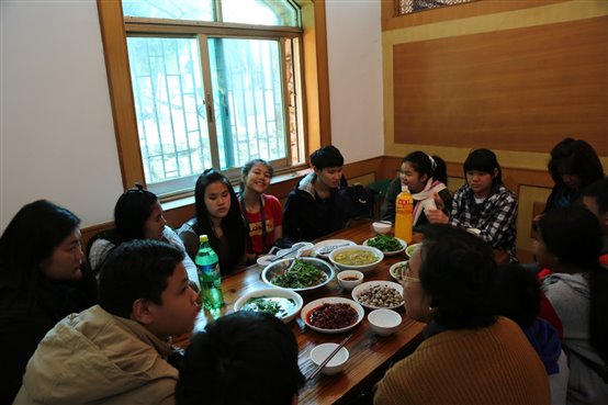 午餐时分,学员们一边吃着中国农家的家常菜,一边向老师、志愿者了解中国的乡土文化和民风民俗。