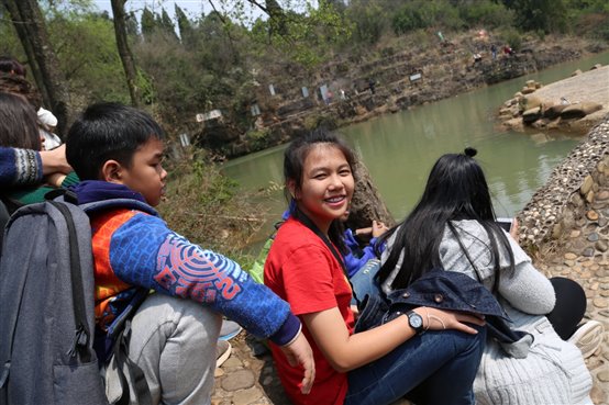 3月18日,繁花初落,一场夜里的风雨让整个曲靖师范学院焕然一新。来自泰国阿伦维塔亚中学汉语语言文化体验班学员们对清晨校园里惊艳的景象感到欣喜。带着喜悦的心情,学员们在国际学院老师、志愿者的带领下,坐上了通往珠江源风景区的公交车。