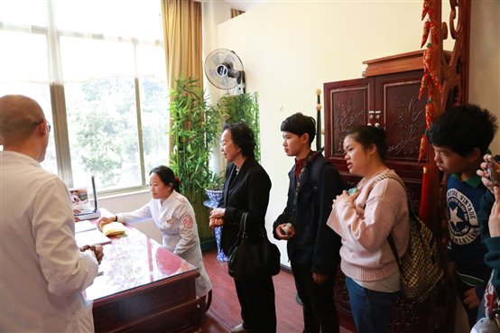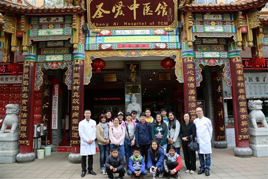 曲靖圣爱中医馆大夫在医馆门口向学员们讲述了中医的历史以及中国医学的传统。学员们对圣爱中医馆“圣者济世,爱心养生”的圣爱精神表示致敬。进入医馆,学员们首先观看了圣爱中医馆的草药展示柜和取药口的五百多种常用药材。丰富多样的草药和成品药让学员们感受了中医的神奇。之后,学员们参观了圣爱中医馆的针灸推拿室,现场观摩了针灸、艾灸、按摩以及拔罐疗法。最后,泰国阿伦维塔亚中学校长助理蓬披蒙老师在圣爱中医馆门诊部体验了一番中医疗法。