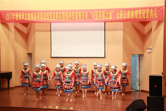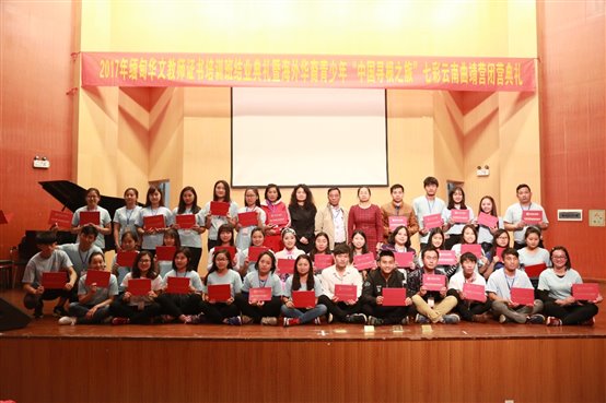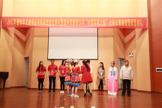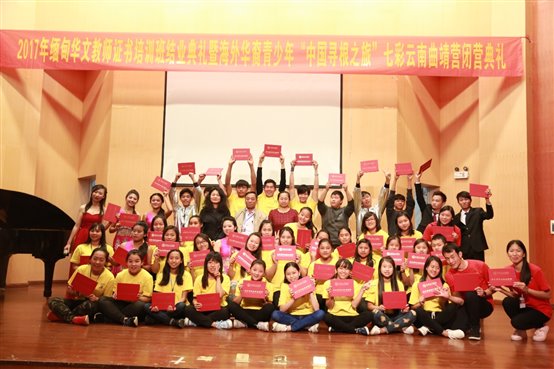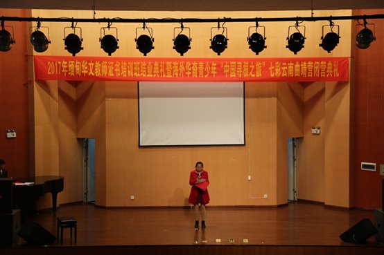4月20日下午, 国际学院在学校音乐与舞蹈学院演播厅举行2017年缅甸华文教师证书培训班第一期结业暨海外华裔青少年“中国寻根之旅”七彩云南曲靖营闭营典礼。曲靖市市人民政府外侨办副主任张燕、缅甸果文文教会会长柳润苍、国际交流与合作处副处长董传飚和国际学院领导出席结业典礼并致辞,出席典礼的各位领导为40名教师学员和50名营员颁发结业证书。来自缅甸的90名华文教师学员和夏令营营员参加。